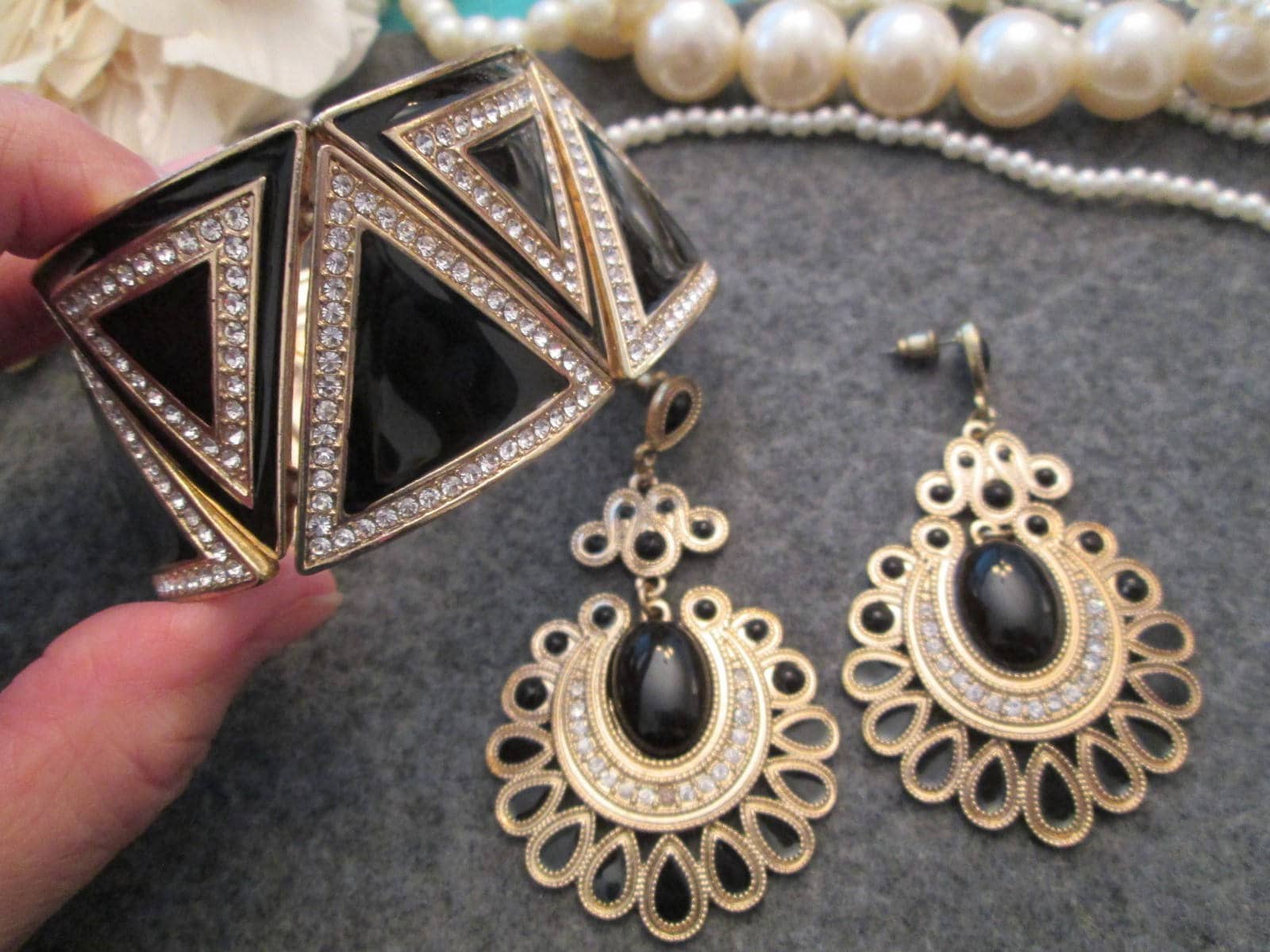 Bracelet & Earrings Set>Onyx Bracelet, Onyx Earrings, Black Jewelry, Onyx Gold Jewelry Set, Gift For Her, Stretch Bracelet, Fun Set