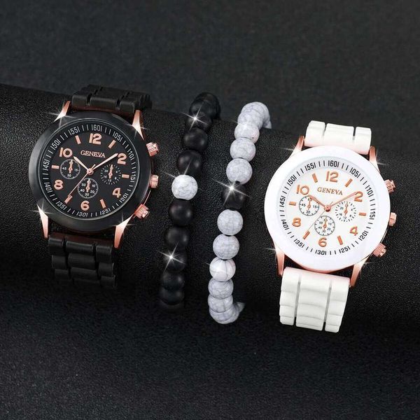 4PCS Couples Fashion Silicone Band Women's Quartz Watch Casual Men's Watches Beads Bracelets Set