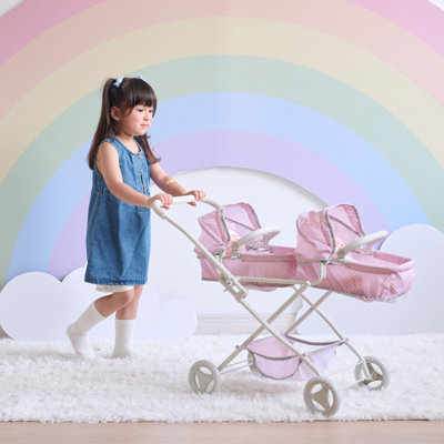 Teamson Kids Polka Dot Princess Baby Doll Twin Bassinet Stroller with Retractable Canopy & Storage