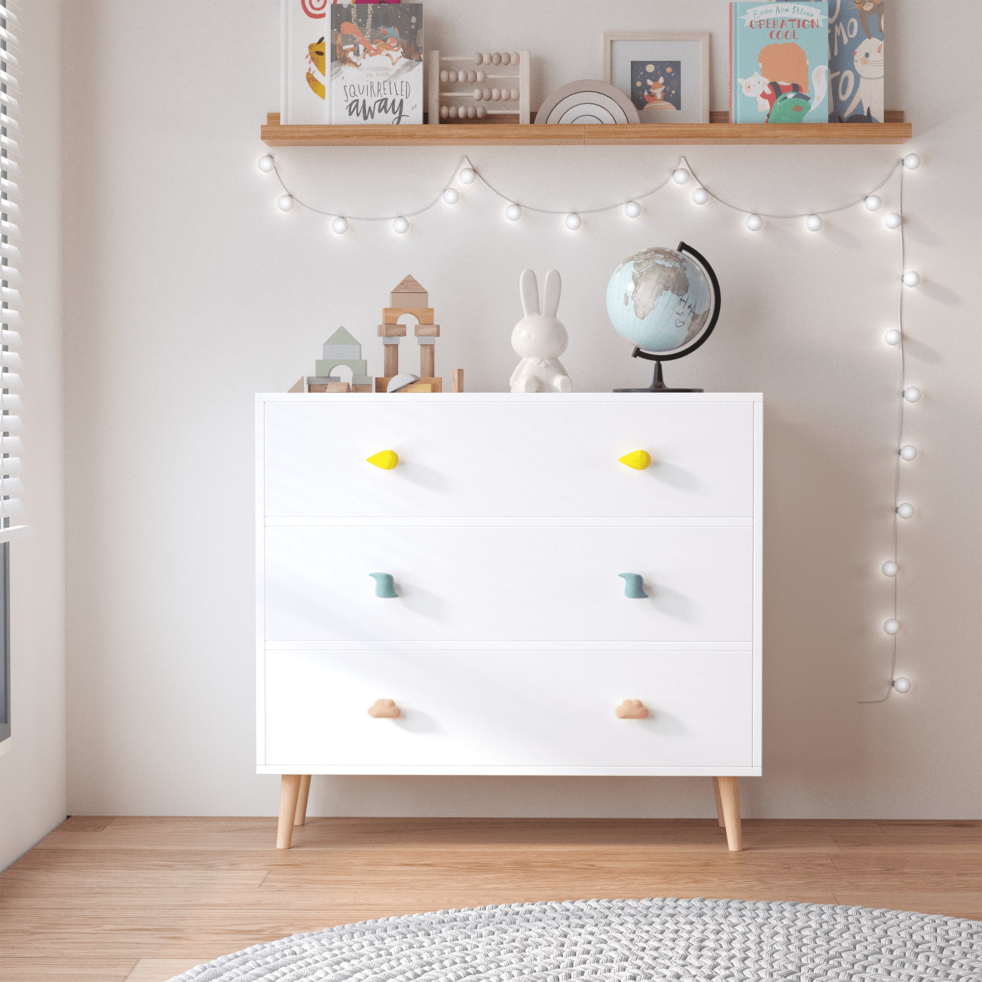 CHILDREN'S BEDROOM THREE DRAWER DRESSER, MODERN WIDE DRAWER STORAGE BEDROOM BABY BEDSIDE TABLE, WOODEN WIDE DRESSER, TODDLER STORAGE CABINET FOR BEDROOM BABY FURNITURE, BABY ROOM, WARDROBE, APARTMENT (WHITE)