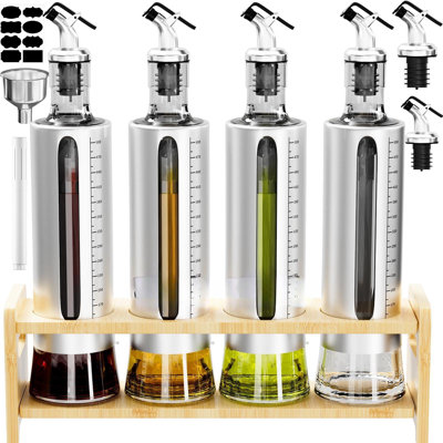 Oil Dispenser Bottle, 4 Pack Glass Olive Oil Dispenser Bottle With Shelf, 17Oz/500 Ml Oil And Vinegar Dispenser Set Wrapped In Stainless Steel Shell W