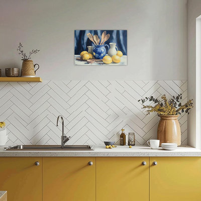 Lemon Wall Art Kitchen Pictures Yellow Lemon And Blue Pottery On Table Painting Vintage Citrus Fruit Canvas Print Artwork Rustic Farmhouse Decor Frame