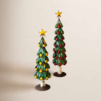 SET OF TWO RECYCLED METAL CHRISTMAS TREES W APPLES & LEMONS