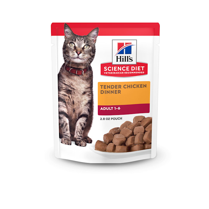 Now Science Diet wet cat food comes in a pouch that's easy to open and easy to feed. With delicious chunks in a decadent gravy, even the most picky eaters will love this soft and tender cat food. Made in the USA with global ingredients you can trust, this food includes clinically proven antioxidants vitamins C+E for a healthy immune system. It's the perfect ...